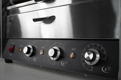 На лицевой стороне оборудования расположен индикатор сети питания, кнопка включения и термостат, имеется поддон для сбора жира, который легко мыть;