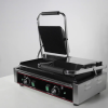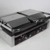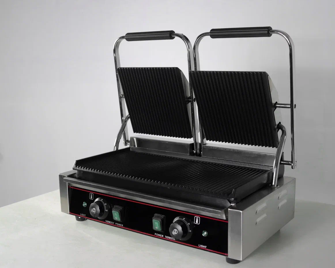 Две секции, поверхность рифленая, температура нагрева 50-300С. Размер рабочей поверхности: нижняя 480х230 мм, верхние 210х220 мм, чугунные рабочие пластины, поддон для жира, индикатор работы и нагрева